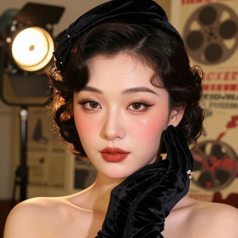 Close-up portrait of a graceful silent film actress with soft glam expressive makeup, her face illuminated by golden film-era studio lights — soft blush, dewy skin, and subtle glitter accents on her lashes, wearing a vintage velvet hat and opera gloves, set against a backdrop of old movie posters and flickering film reels.