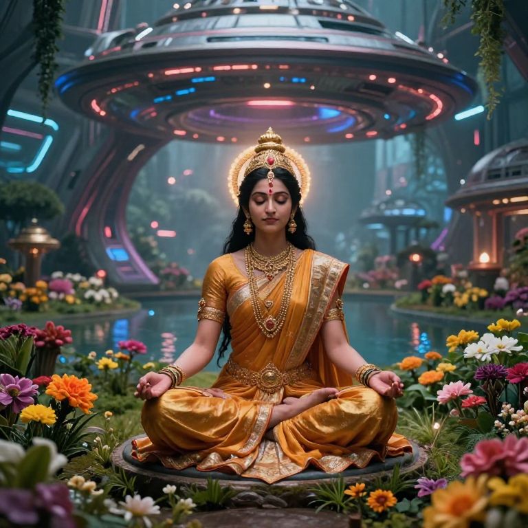 Gore Godess Sita meditate in a beautify garden of flowers and lake in spaceship, cinematic lighting, engergetic feel, mood lighting, fututistic, cyberpunk, spaceship,