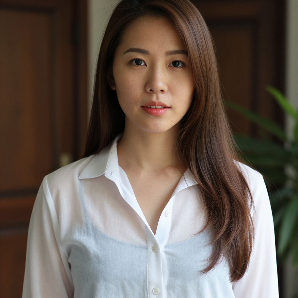 Photograph of an Asian woman with long, straight brown hair, wearing a white button-down shirt, standing indoors against a blurred wooden door background.