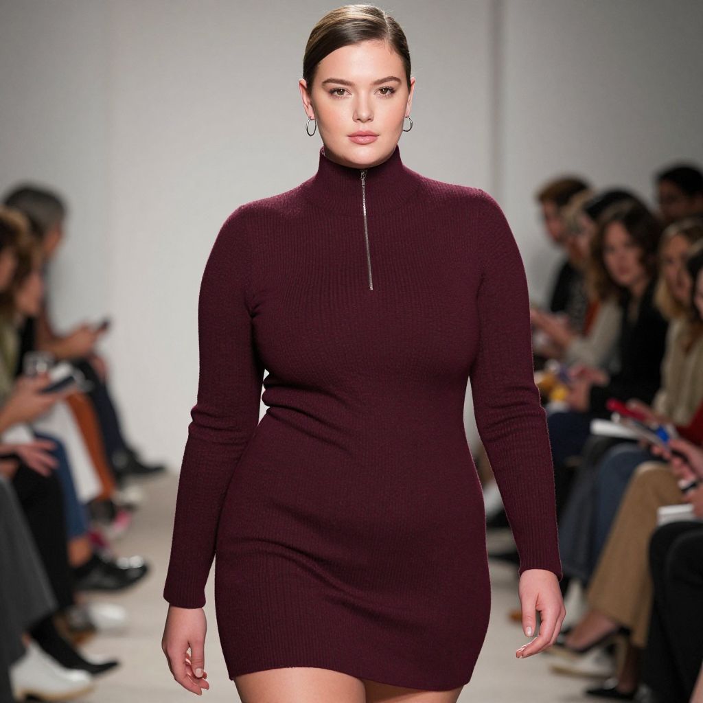 A Plus-size woman, minimalistic chic, body-hugging burgundy mini dress, ribbed knit texture, high neckline, long sleeves, partial zipper front, simple hoop earrings, at a fashion show after-party. Fine art style, soft brush strokes, delicate details, ethereal lighting. Sexy. Pretty face and beаutiful eyes. Big breasts
