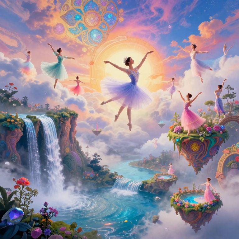 Craft an entrancing digital artwork by blending surrealism's dreamlike essence with Jugendstil's vibrant hues and intricate ornamentation, depicting an ethereal ballet in the heavens where spectral dancers wearing translucent garments perform their celestial choreography. From a high vantage point, witness a landscape of whimsical beauty, with waterfalls cascading over painted cliffs into pools that sparkle like gems, and drifting islands holding hidden gardens veiled by wisps of mist. These otherworldly performers gracefully soar through the clouds, as if their bodies were an extension of the sky's vibrant palette, moving harmoniously to a melancholic symphony whispered by gentle breezes. This visual masterpiece should evoke both awe and serenity in its surreal elements and lavish ornamentation, inviting the viewer to surrender to the spellbinding allure of a fantastical realm where imagination and beauty intertwine seamlessly.