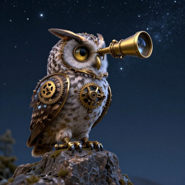 Whimsical steampunk owl perched atop a rocky outcrop, its golden mechanical eye equipped with a telescope scanning the starry night sky, while its fluffy feathers and intricate cogs reflect the celestial wonder above.