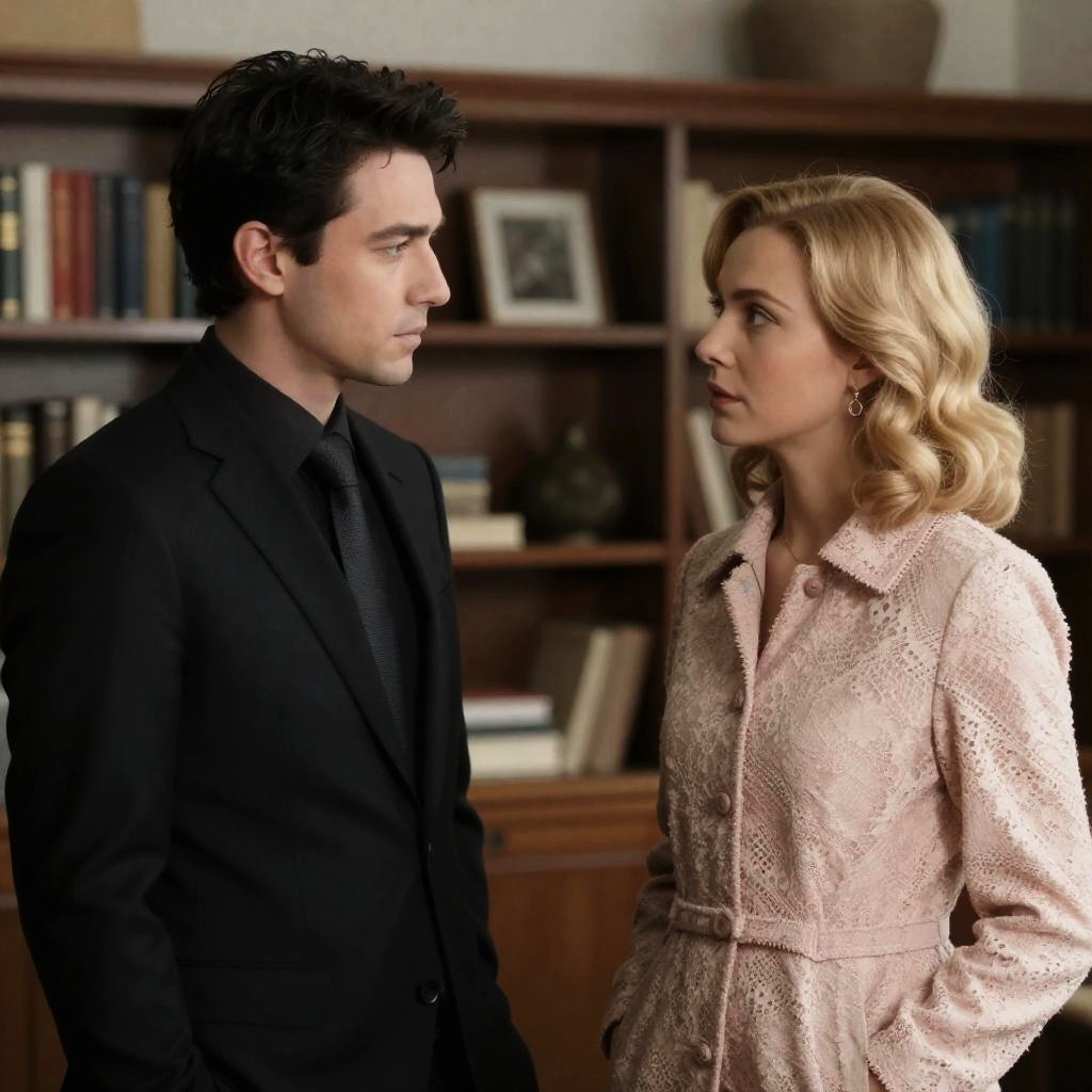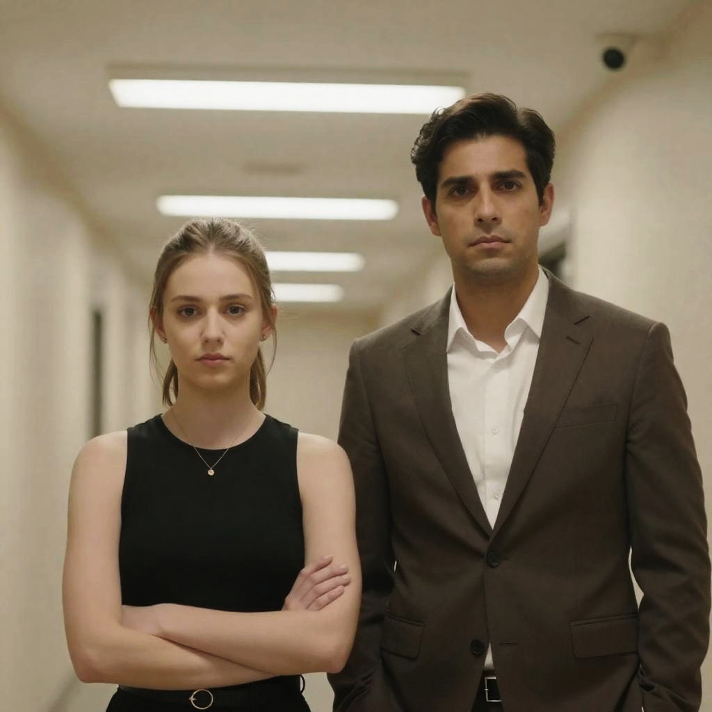 Photograph of two people sitting outside a brick building. A woman with pale skin, wearing a brown hat with an ornate band, beige coat, and green patterned dress, looks slightly to the left. A man with dark hair, wearing a grey vest over a white shirt and brown patterned tie, looks at her. The woman has a neutral expression, while the man's expression is focused. Green door frame in the background.
