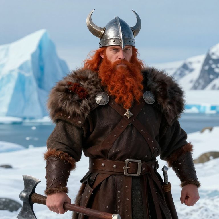 "Lovely Civilization game art, Age of Mythology artwork, Eric Le Rouge, Eiríkr Þorvaldsson, vikings, red beard, red hair, viking helmet, ax in hand, Greenland, ice berg in background,"
