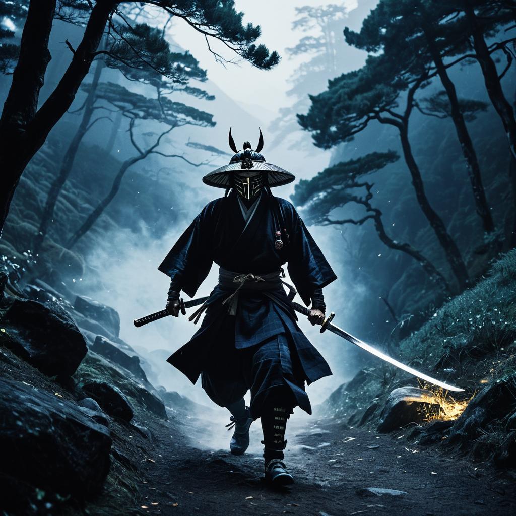 A ethereal samurai, with glowing katana and radiant masks, engaging in an intense duel with shadow spirits, in a mystical mountain path veiled in twilight mist, depicted in the epic and celestial style of Masami Kurumada.