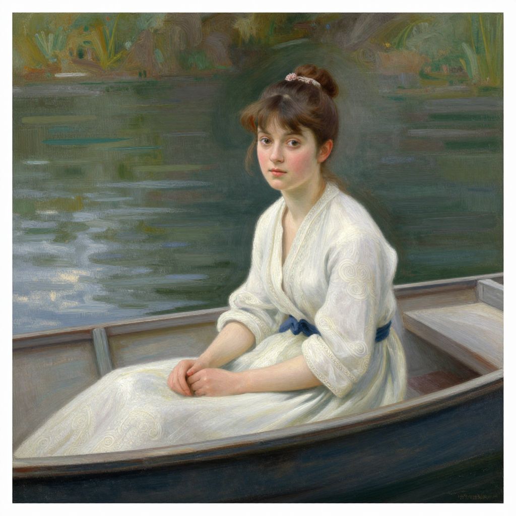 This digital painting depicts a young woman with fair skin and dark brown hair in a bun, adorned with a small pink hairpin, sitting in a wooden rowboat on a calm, reflective body of water. She wears a white, long-sleeved, embroidered dress with a blue ribbon tied at the waist. Her expression is calm and slightly wistful. The background features blurred green and brown hues, suggesting a natural, serene lakeside setting. The boat has a simple, rustic design, and the water reflects subtle light and shadows. The painting uses soft, realistic brushstrokes and a gentle color palette, evoking a peaceful, nostalgic atmosphere.