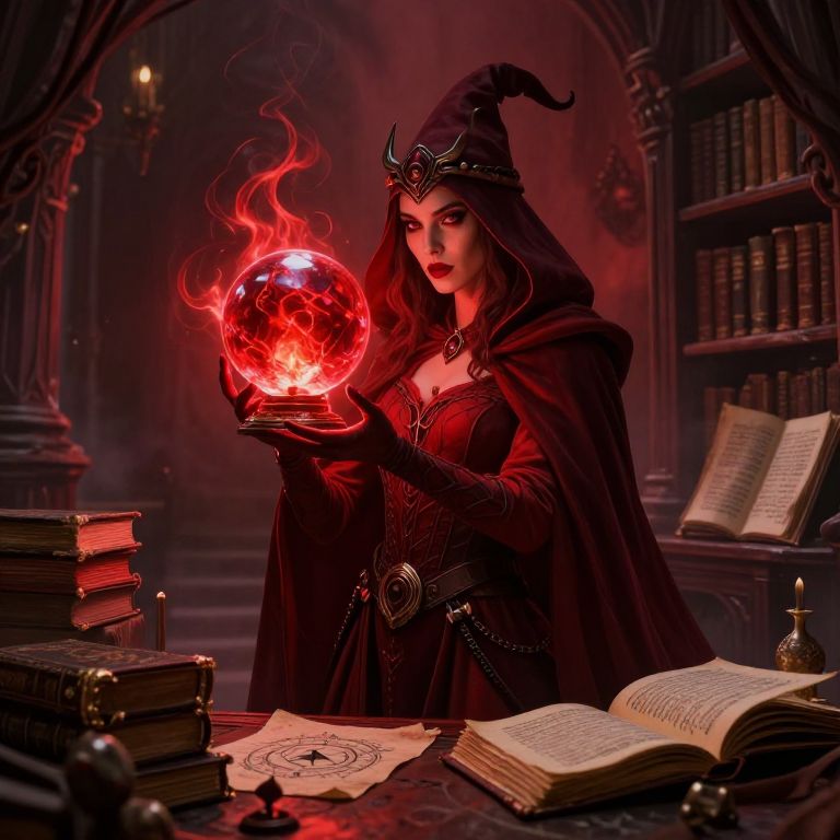 Digital art of a mysterious witch in a dark red cloak, holding a glowing red orb of fire, surrounded by books and an open spellbook in a