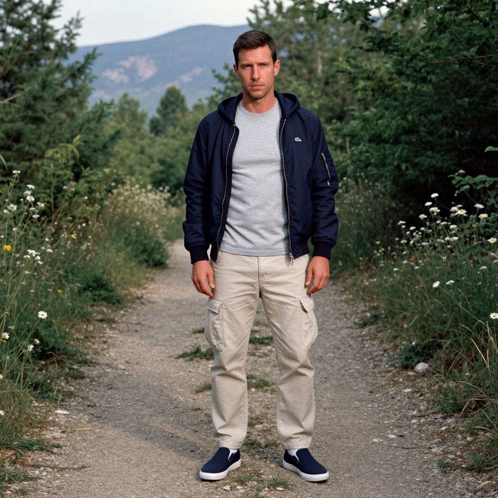 Photograph of a handsome, Caucasian man with short brown hair and a serious expression standing on a gravel path surrounded by greenery. He wears a black jacket over a white t-shirt, beige cargo pants, and black sneakers with white soles. The background features a wooded area with tall trees and white wildflowers on either side of the path. Distant mountains are visible under a partly cloudy sky. The man's stance is relaxed, with his hands by his sides, centered in the frame. The image has a realistic, natural style.