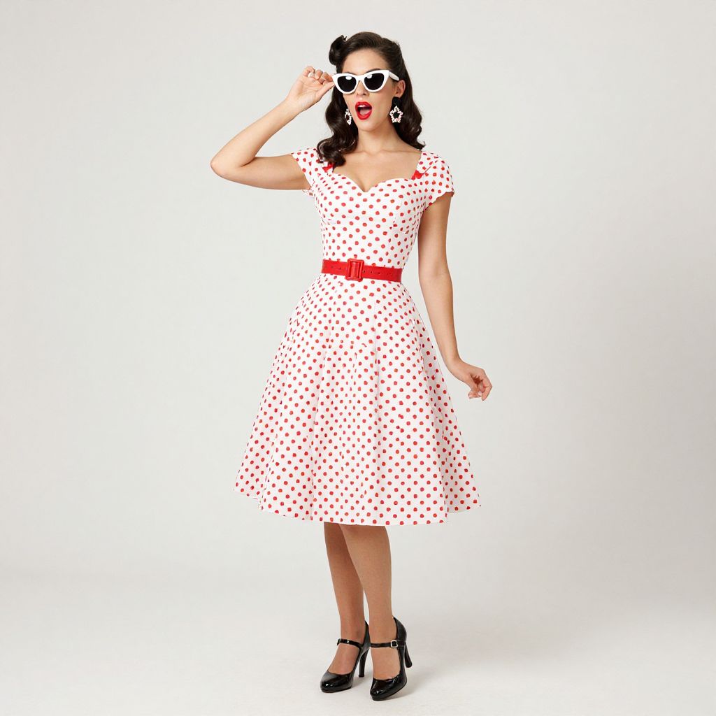 Photograph of a pale-skinned woman with black wavy hair, red polka dot dress, black gloves, red bow, standing in a sun