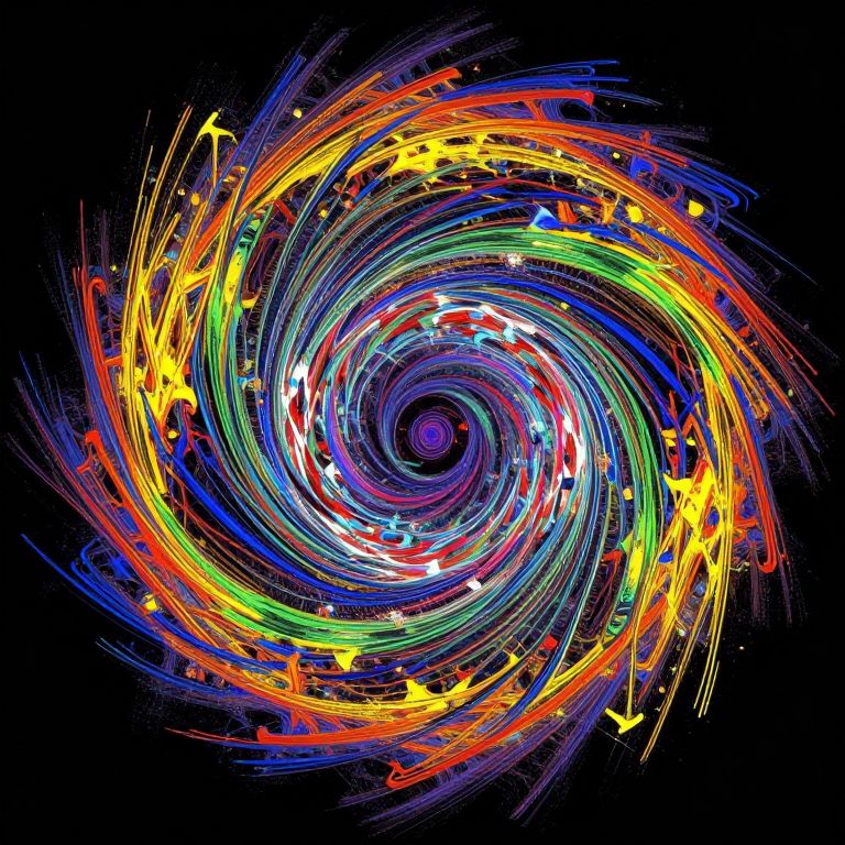 Vibrant, swirling abstract digital artwork with colorful, neon-like lines forming a dynamic spiral against a black background, creating a sense of motion and energy