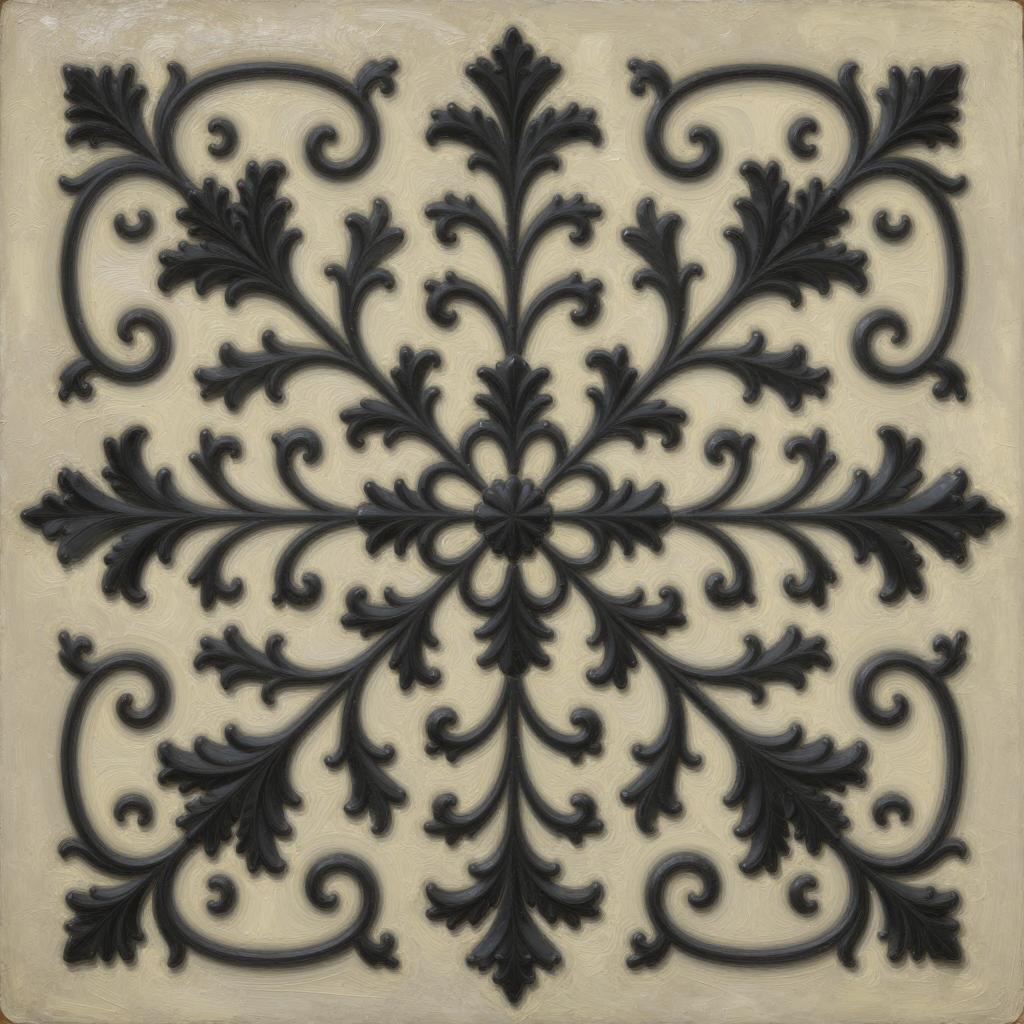 Scrollworks pattern featuring dense Baroque acanthus leaves and curling vines in matte black scrollwork on pale ivory arranged as radiating scrolls from the center forming a mandala-like design on polished engraved metal plate rendered as oil painting style with soft blended highlights and brush texture, ultra-detailed, sharp ornamental design, high resolution, intricate decorative pattern art