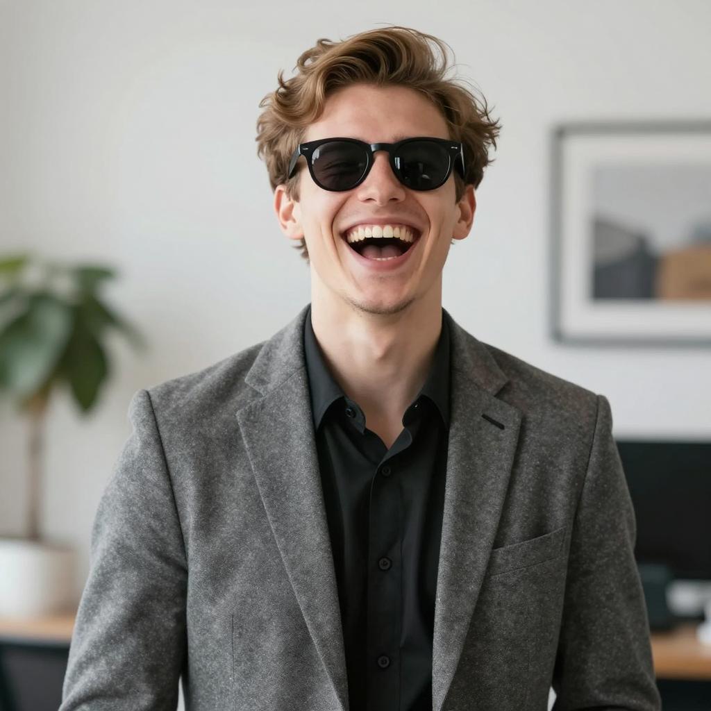 Young man with short brown hair, black sunglasses, gray blazer, black shirt, laughing loudly. Background includes blurred office decor with plants and framed pictures. He is positioned slightly to the right, face turned to the left.