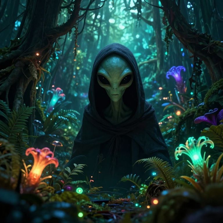 Digital artwork depicting a mysterious, humanoid figure with an alien-like skull face, cloaked in a dark hooded robe, standing in a dense, enchanted forest. The figure has large, glowing eyes and is surrounded by vibrant, bioluminescent mushrooms in shades of red, orange, green, and blue. The forest is dark and moody, with twisted trees and dense foliage, illuminated by the glowing mushrooms. The scene has a surreal, otherworldly feel, with the figure centered in the foreground, bathed in the soft, ethereal light of the surrounding flora.