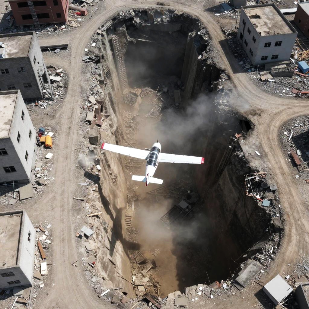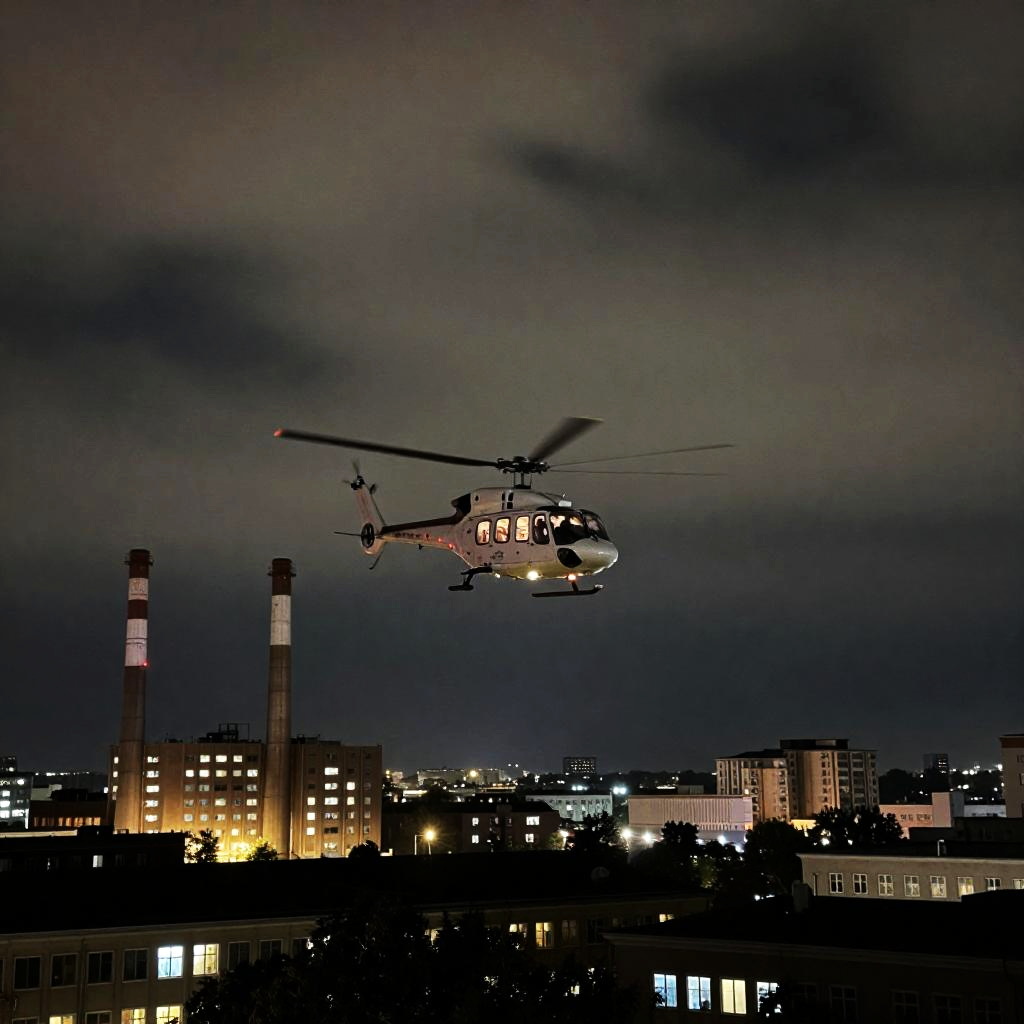 Nighttime photograph of a cityscape with a hovering helicopter in the foreground. Dark, cloudy sky. Industrial buildings with lit windows and tall smokestacks in the background. Helicopter has red and white lights. Urban setting.