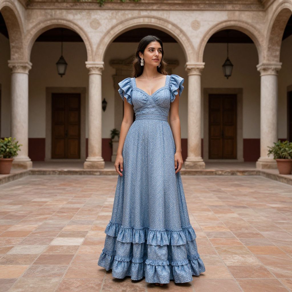 Spanish Frilly Dress, woman in a blue dress standing in a courtyard