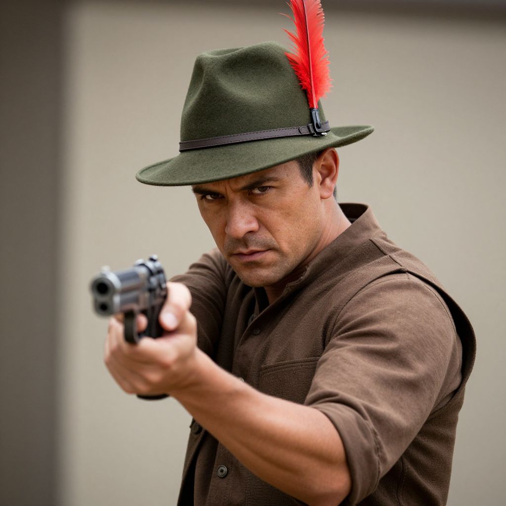 A rugged man in his late 30s, with a determined, serious expression, wearing a brown outfit and a distinctive green hat adorned with a bright red feather. He is confidently holding a gun in his right hand, ready for action.