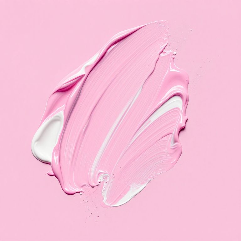 The image presents an abstract acrylic texture on a pastel pink background, with a 3:2 aspect ratio. The texture is composed of various shades of pink and white, creating a dynamic and fluid appearance. The paint appears thick and has been applied in a manner that suggests movement and depth, with some areas showing drips and splatters that add to the organic feel. The composition is asymmetrical, with the paint strokes and drips creating a sense of randomness and spontaneity. The overall effect is one of softness and gentle intensity, with the pastel pink background providing a calming contrast to the vibrant, textured foreground.