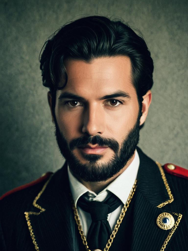 Fantasy male costume, 1boy, facial hair, beard, solo, male focus, mustache, looking at viewer, jewelry