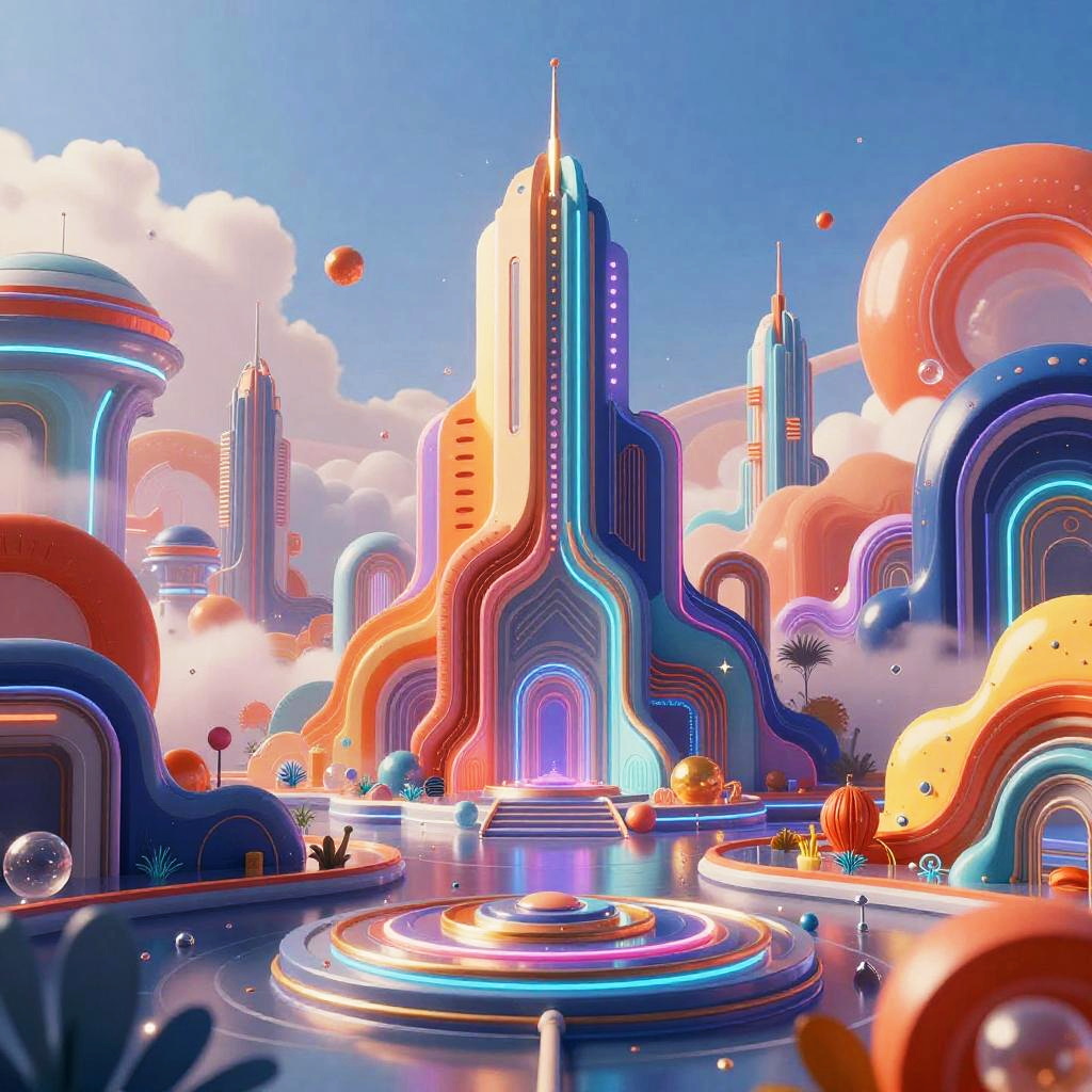 Vibrant, surreal digital artwork of a colorful, whimsical alien landscape with glowing archways, floating orbs, and a central water feature.