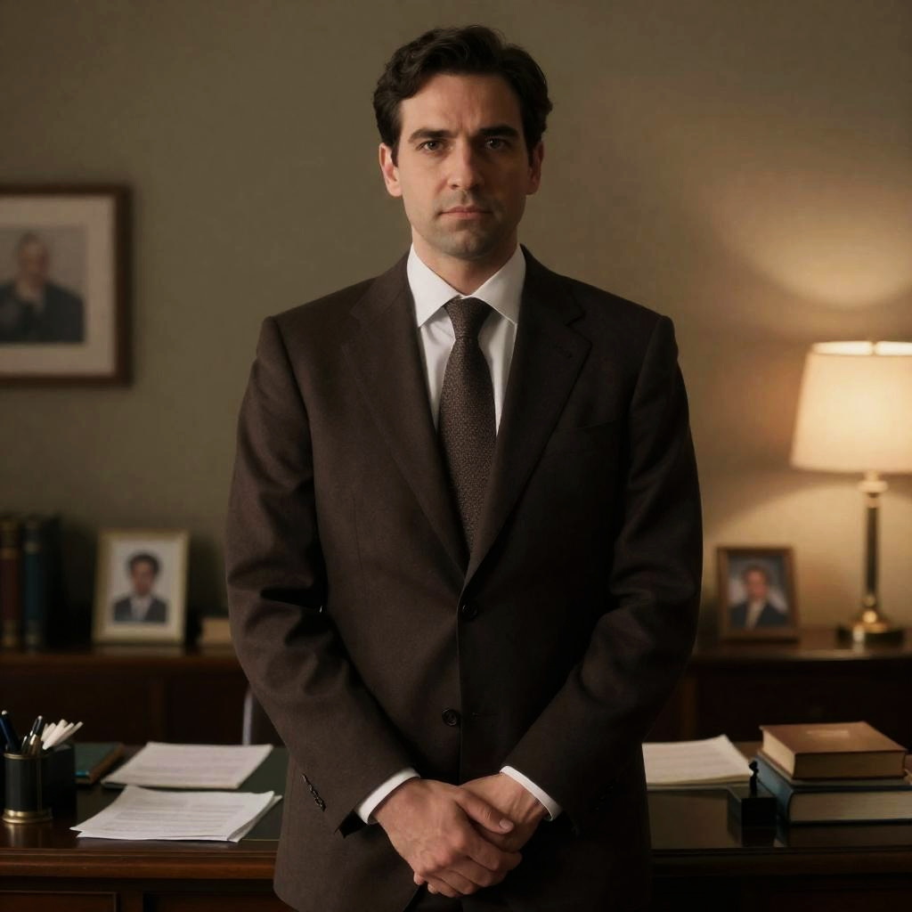 Serious Man in Pinstripe Suit at Desk