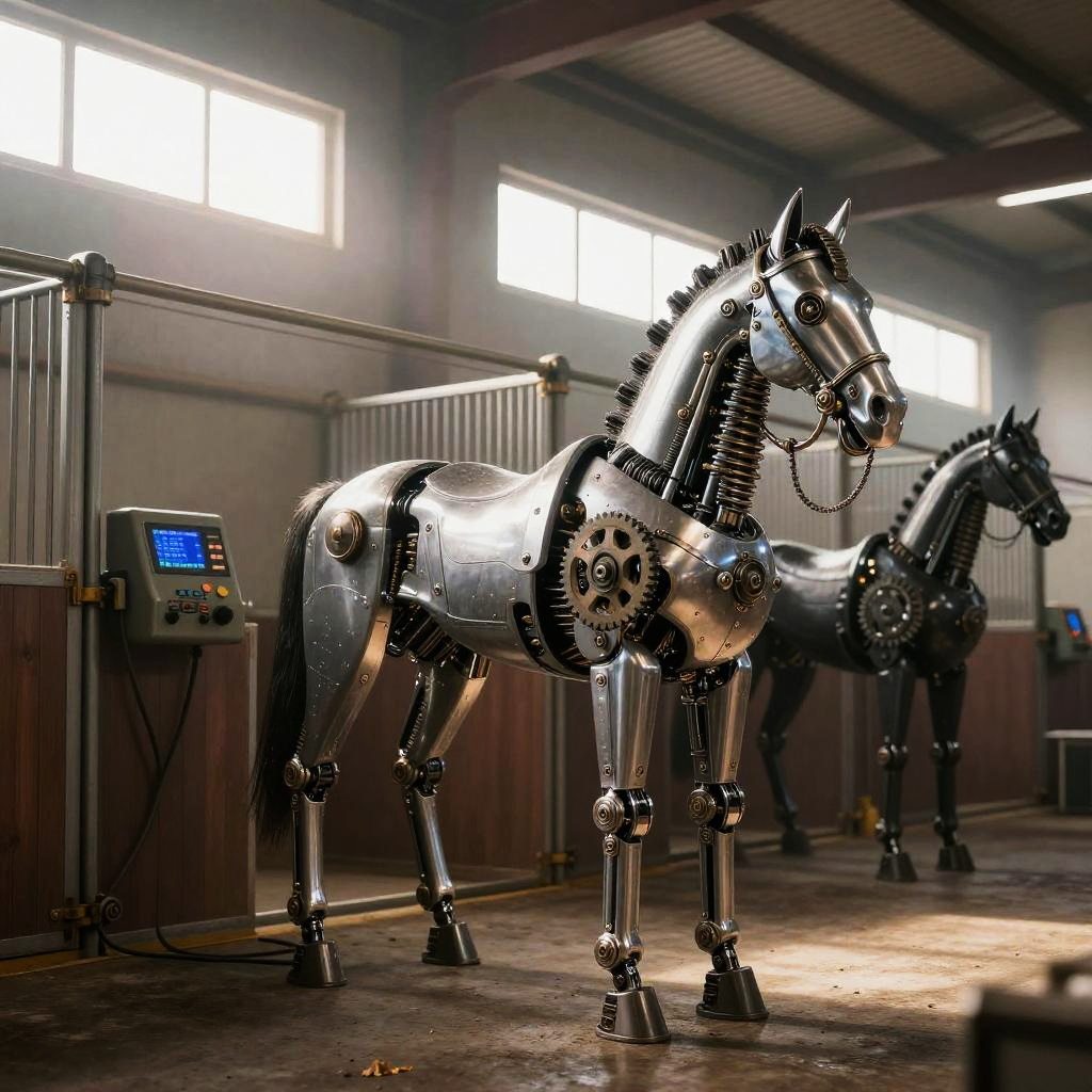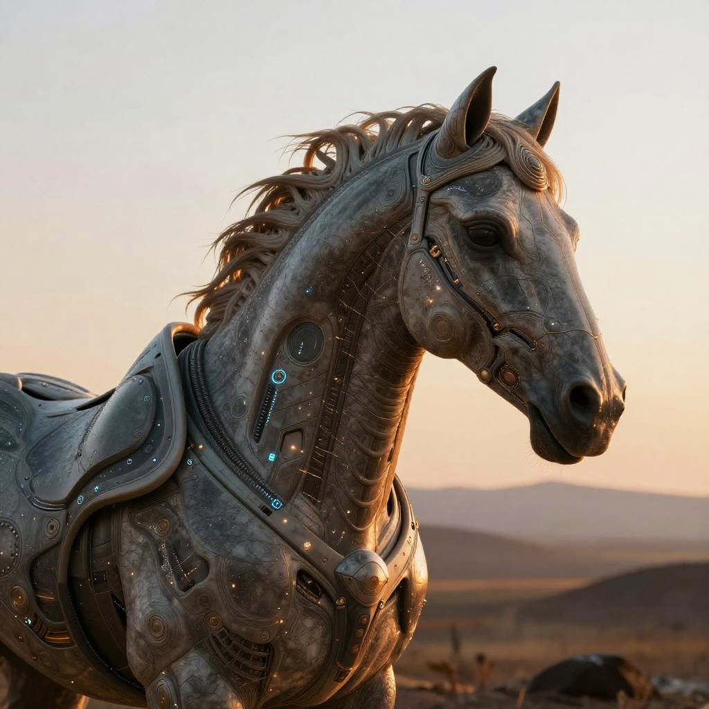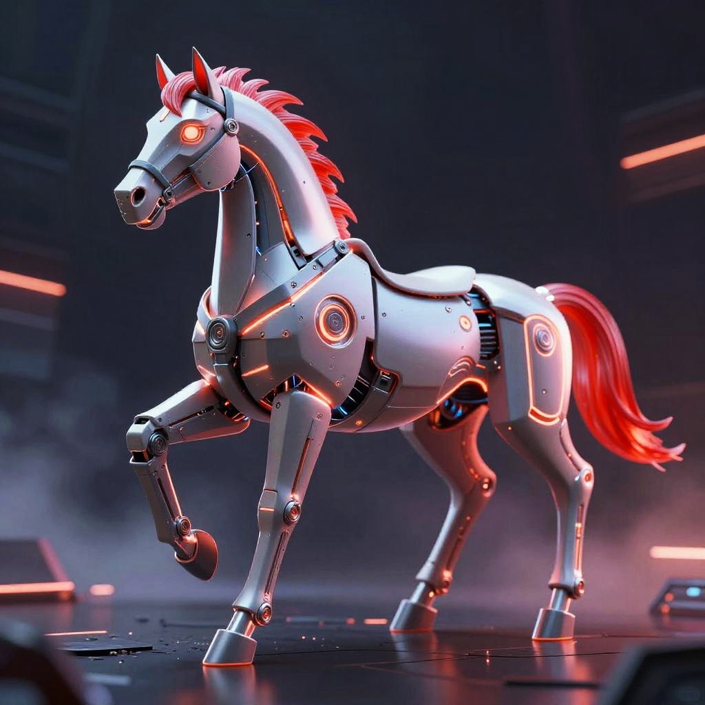 3D cybernetic samurai horse, rendered in a futuristic neon theme within glowing technicolor battlefield at dawn, glowing edges and dynamic reflections, dark abstract background with subtle geometric patterns, high-poly hard-surface detail, calibrated color grading, volumetric fog, rim lighting, soft bloom, global illumination, ambient occlusion, reflective wet floor, ultra sharp microdetail, octane/unreal look, accented by matte silver and glowing scarlet, depth of field, noise-free finish