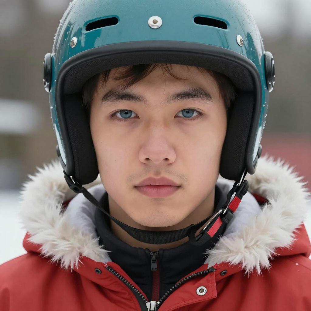 A close-up digital portrait of a young man wearing a teal helmet and a luxurious red coat with white fur trim. The image features a hyper-realistic, stylized art style with smooth shading and detailed facial features, emphasizing the subject's blue eyes and slight beard stubble.