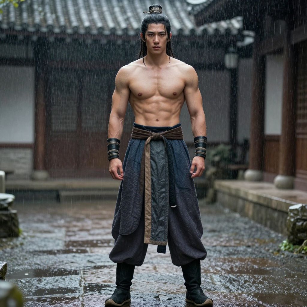 Handsome, korean man, Muscular, full body, very handsome, Realistic, rain, (ultra detailed), (ultra realistic), RAW photo, photorealistic, 8k, high res, Handsome ancient chinese man