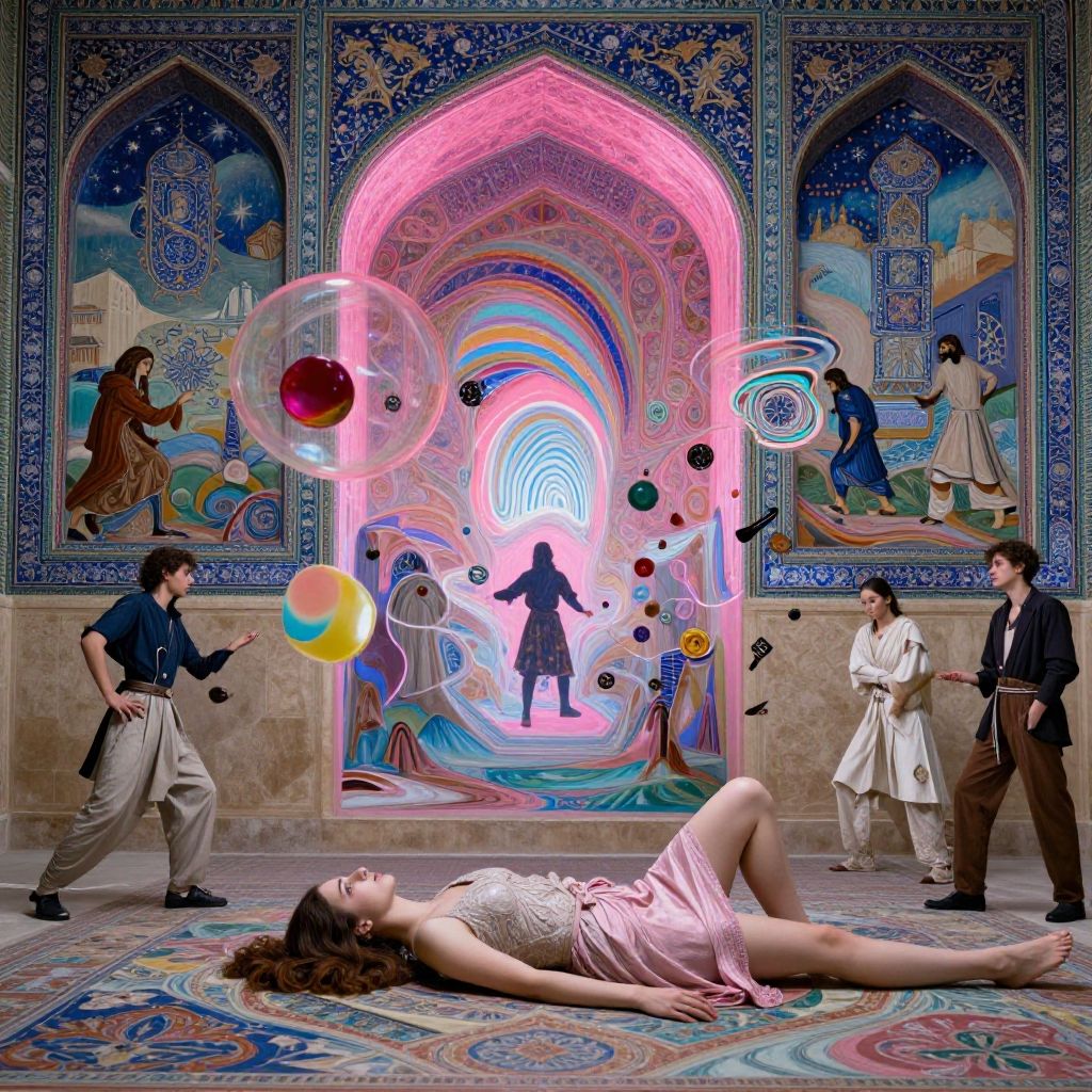 This digital artwork depicts a surreal scene in a richly decorated, Middle Eastern-style room with intricate blue and gold tile patterns. A young woman with long brown hair, wearing a pink dress, lies on a colorful, ornate rug in the foreground, eyes closed. In the background, a large, glowing pink archway frames a silhouetted figure amidst swirling, translucent bubbles in vibrant colors. Four men in modern and traditional attire stand around, watching. The room's walls feature detailed, colorful murals of figures and architectural elements, adding to the fantastical atmosphere. The overall style is a blend of surrealism and digital art.