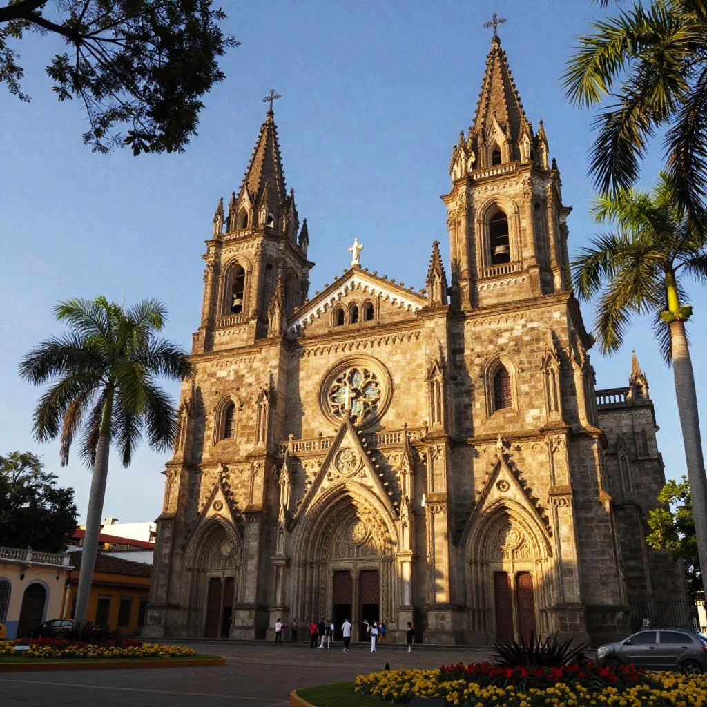Venezuela landmarks illustrating the imposing Catedral de Caracas with its neo-Gothic architecture, surrounded by tropical trees and flower beds, tourists admiring the facade, bathed in warm afternoon light, emphasizing architectural detail and vibrant colors.
