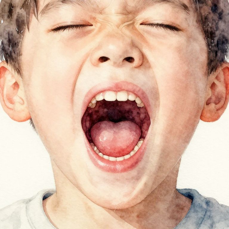 A watercolor painting of a boy uvula inside an open mouth, soft brush strokes, warm tones for a gentle and approachable medical art piece focused on throat health