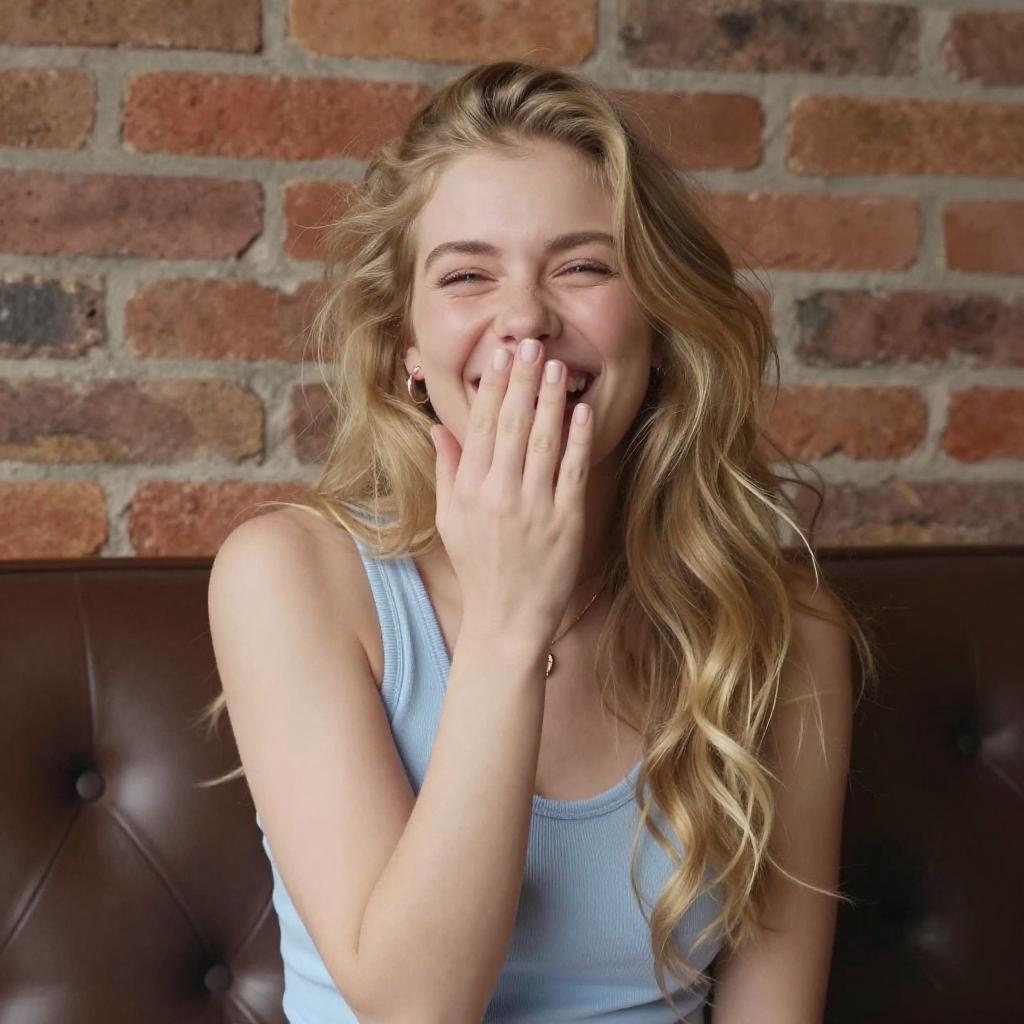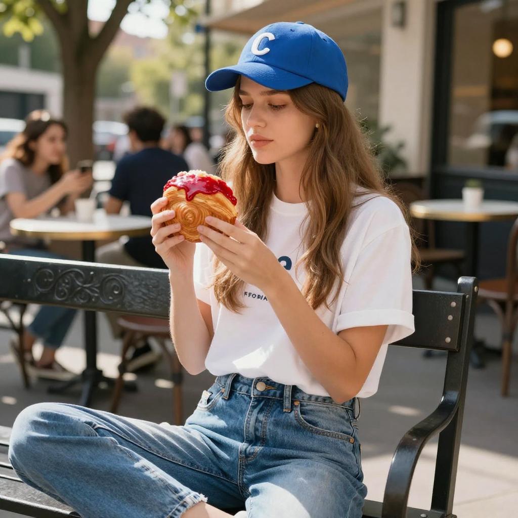 Photograph of a young woman with long blonde hair in a white tank top and red pants, sitting on a teal couch. She is eating from a plate of fried chicken and waffles, with a slice of chocolate cake on another plate in front of her. A black cap with red is on the table. Striped pillows are in the background.
