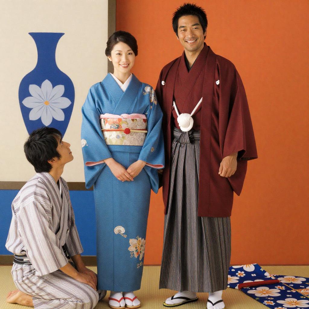 Movie poster with two main characters in traditional Japanese clothing. A woman in a blue kimono with a red obi stands next to a man in a dark red kimono. Both smile. A kneeling man in a striped shirt looks up. Background includes a vase and blue floral pattern. Lower right corner has a blue floral kimono. Bright orange and blue colors dominate.