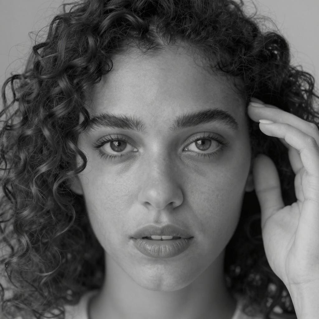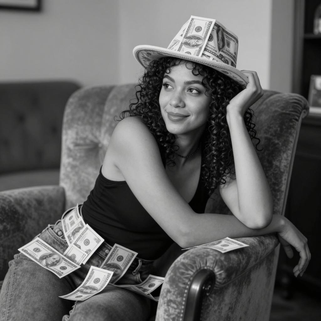 Black and white photograph of a woman with curly hair and a money hat, leaning on a chair. Money bills cover her lap and the chair. She smiles slightly, looking to the side. Background includes ured walls and large, cushioned furniture. Her right hand rests on her head, and her left arm is on the chair.