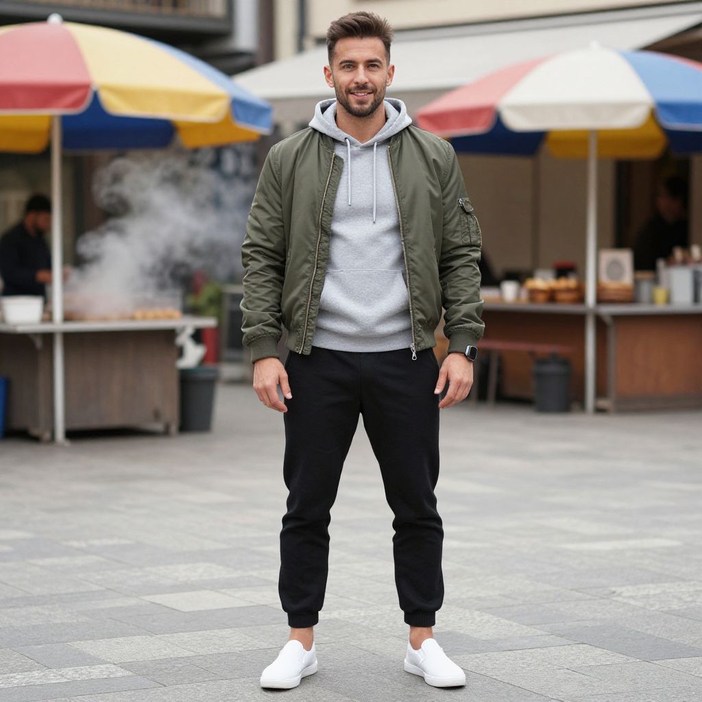 A man, olive green bomber jacket, grey fitted hoodie, black tapered sweatpants, white slip-on trainers, relaxed and sporty vibe, open-air plaza, colorful umbrellas, aromatic food stalls, camera obscura style, cheerful expressionMan has masculine face and piercing eyes
