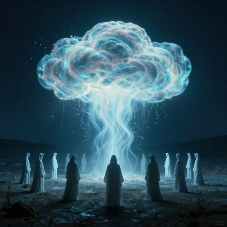 A spectral procession of cloaked figures stands before a luminous, bioluminescent cloud that hovers above them, casting an ethereal glow over a desolate landscape where gravity seems to bend light into a mystical beam connecting earth and sky.