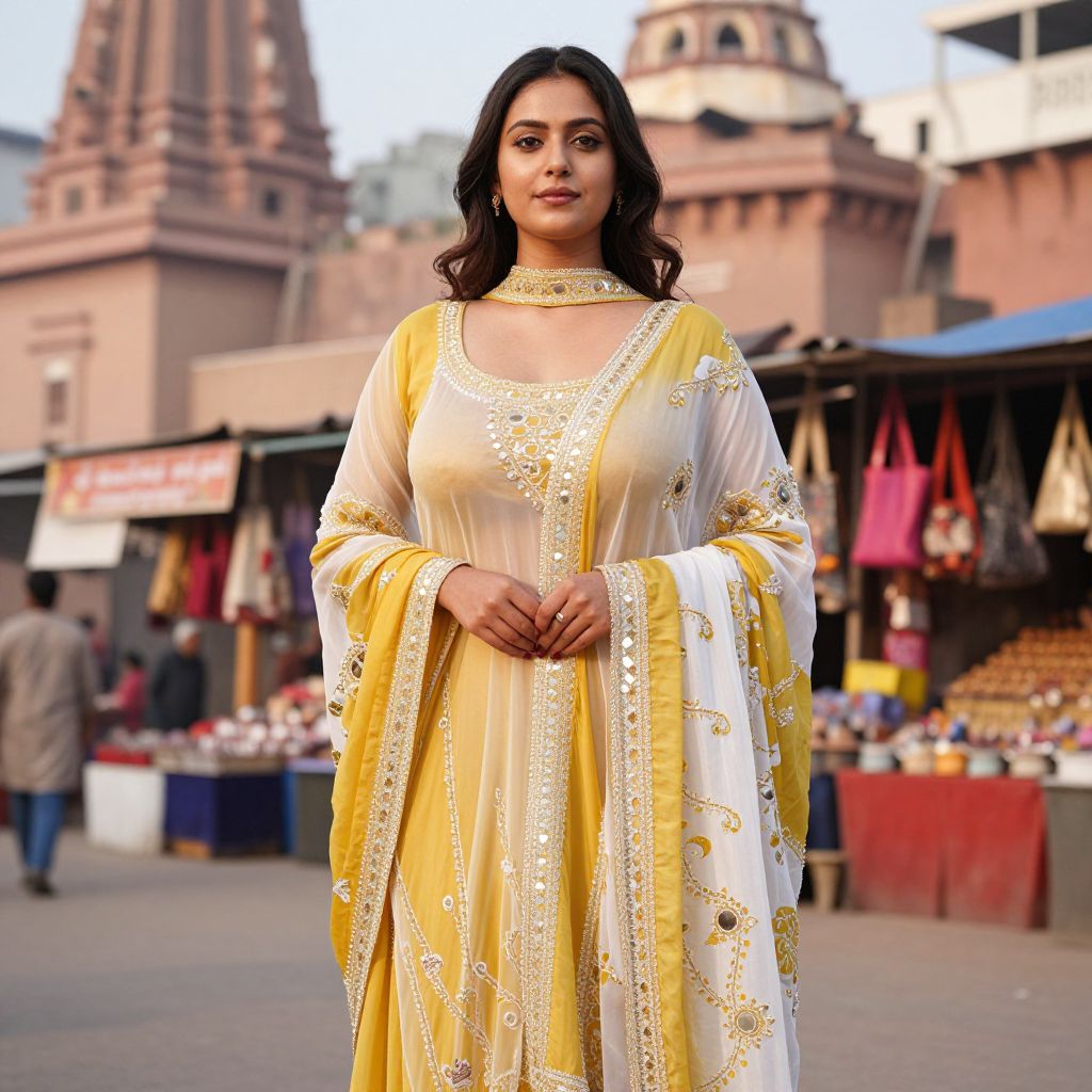 Photograph of a confident Indian woman with medium brown skin, black wavy hair, wearing a yellow and white embroidered traditional dress, standing in a bustling