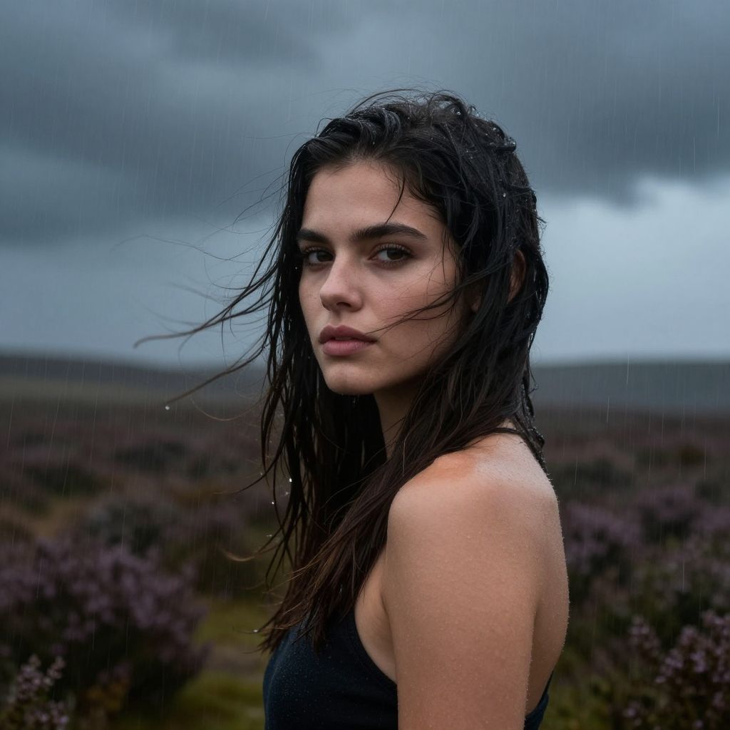 DEN_sofia_gomezMK2(windswept in the (heather moors:1.2) on a (rainy day:1.2), scenic, (dark cloudy skies:1.1), (raining:1.2), windy, (heavy rain:1.2), (rain drops falling:1.1), heavy rain fall, (atmospheric:1.2):1.2), bokeh, f1.4, 40mm, photorealistic, raw, 8k, textured skin, skin pores