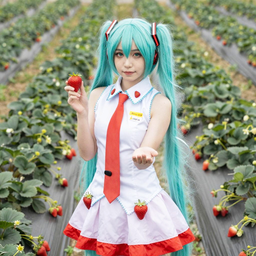 Strawberry Miku Cosplay, woman in a strawberry field with a strawberry