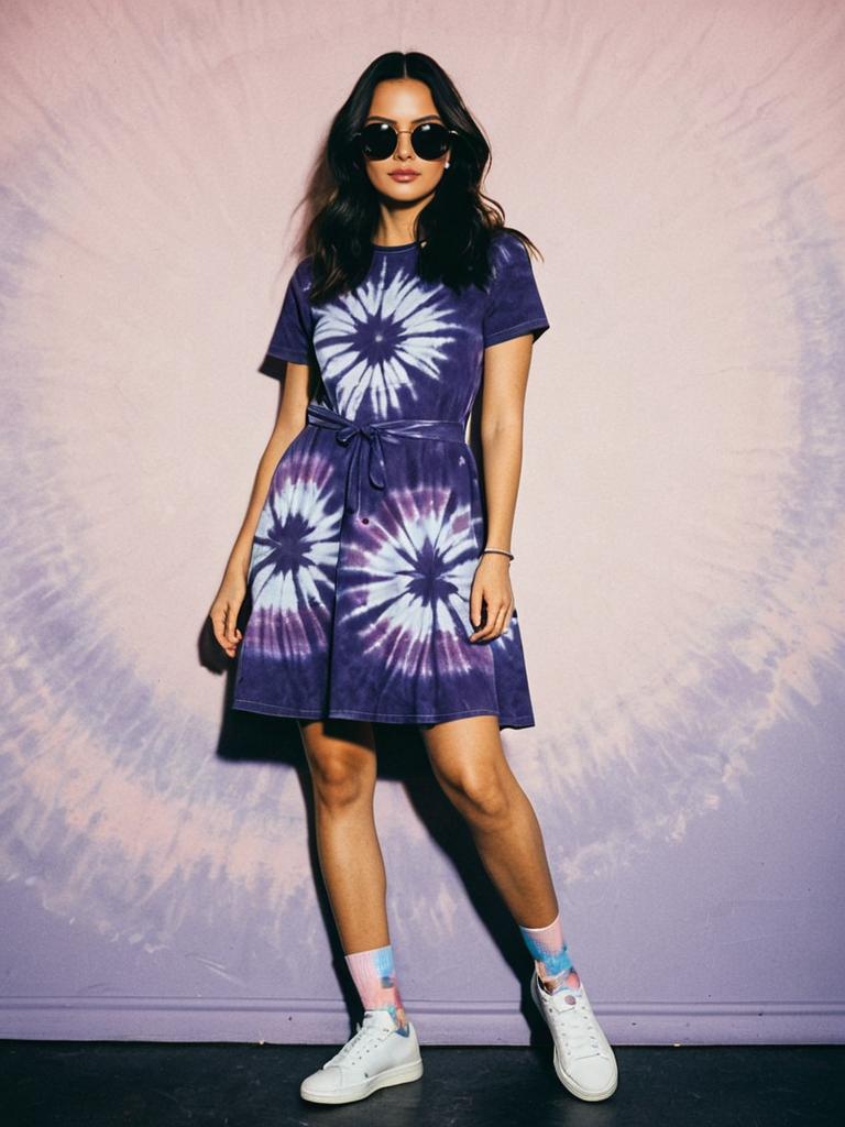 Woman, contemporary casual, short A-line dress with tie-dye in shades of purple and blue, crew neck, short sleeves, visible waist seam, white sneakers with floral embroidery, ankle socks, tinted round sunglasses, pastel-hued studio background --sref 1399
