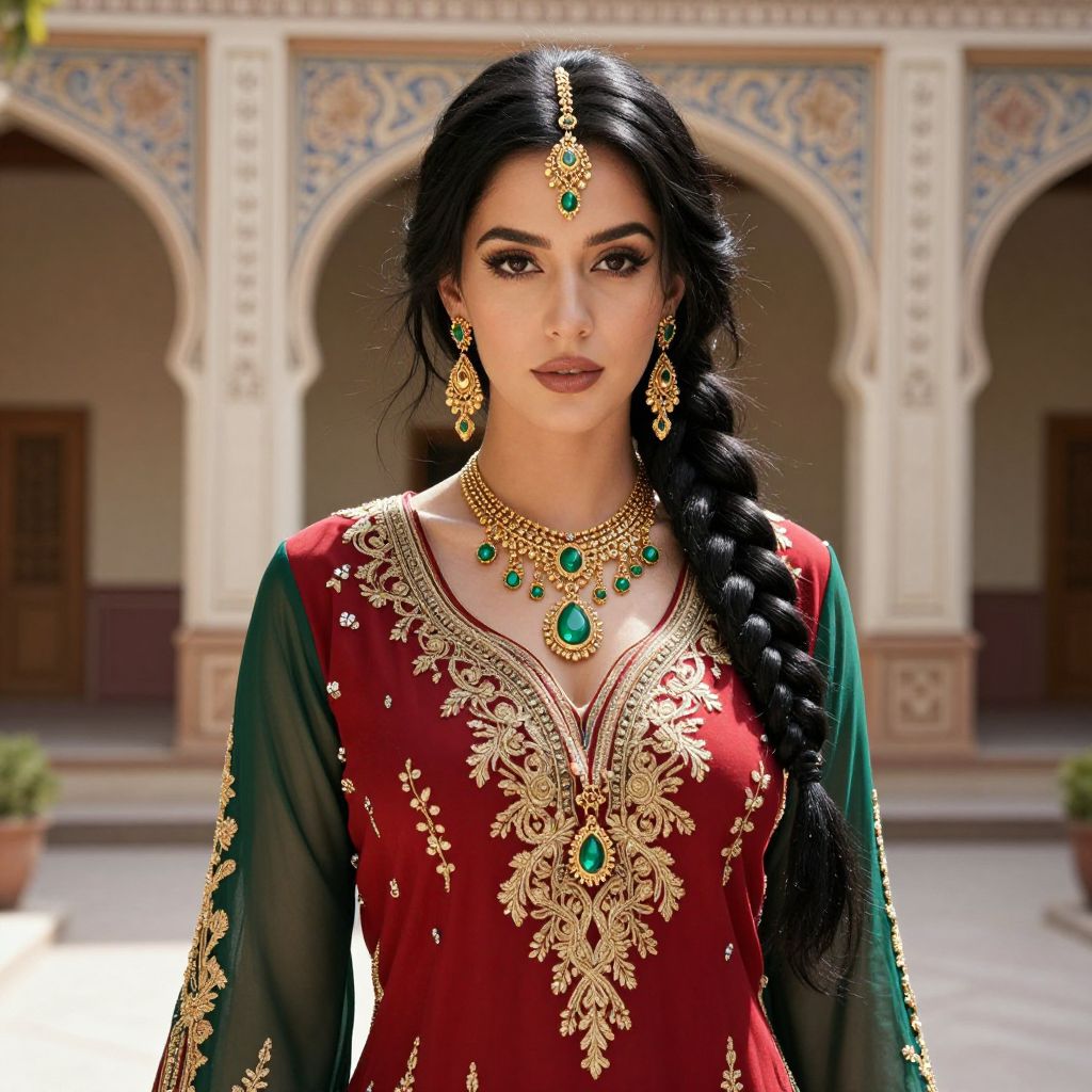 Photograph of a beautiful South Asian woman with long, black, braided hair, wearing a traditional red and green embroidered kurta with gold embellishments. She has a green forehead bindi, matching green earrings, and a necklace with a large central green gemstone. Her dark eyes are accentuated with subtle makeup. The background features an ornate, archway-style building with intricate blue and white tile patterns. The image has a soft, natural light, highlighting her elegant attire and serene expression.