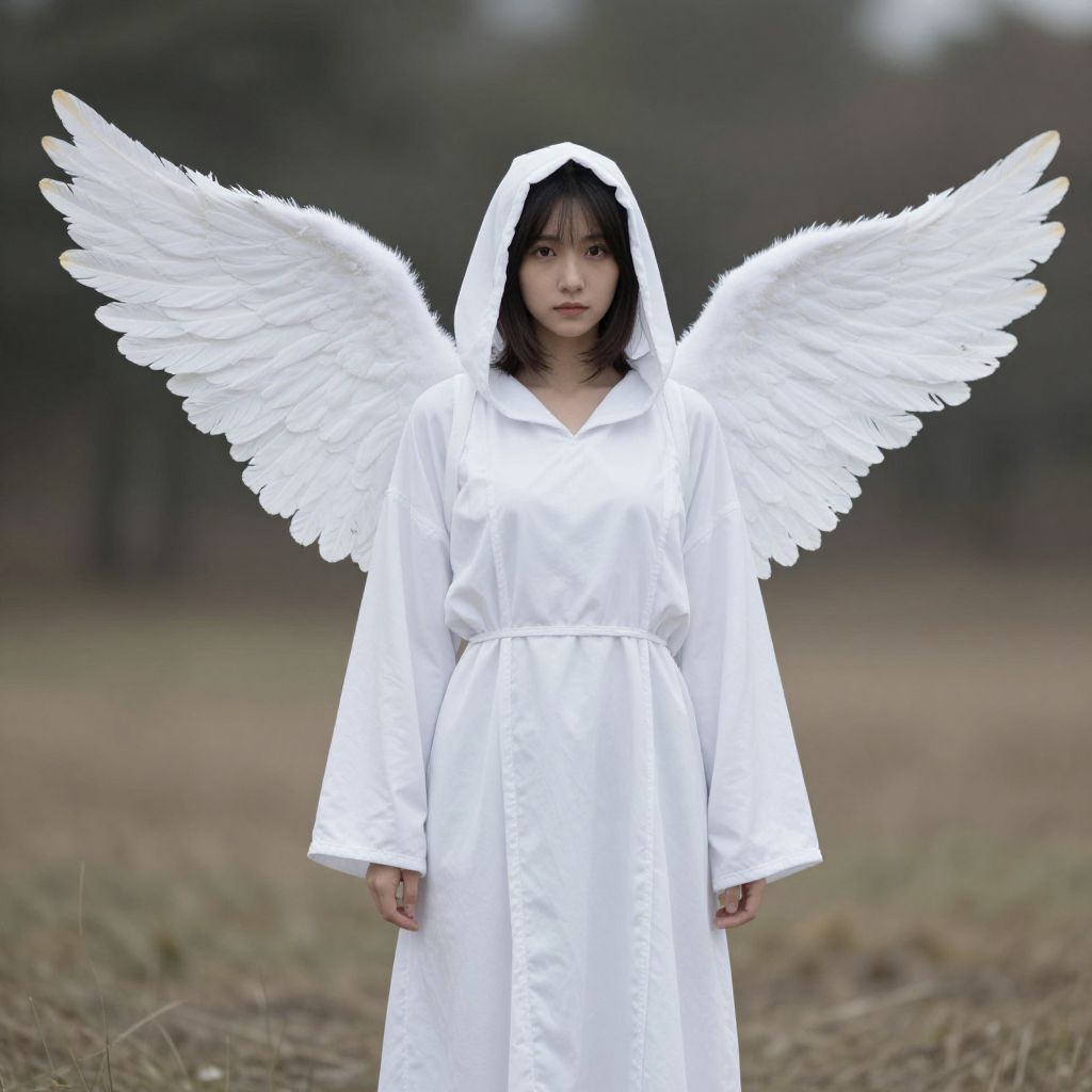 Photograph of an Asian woman with black hair, wearing a white angelic robe and large white wings, standing in a blurred, grassy field.