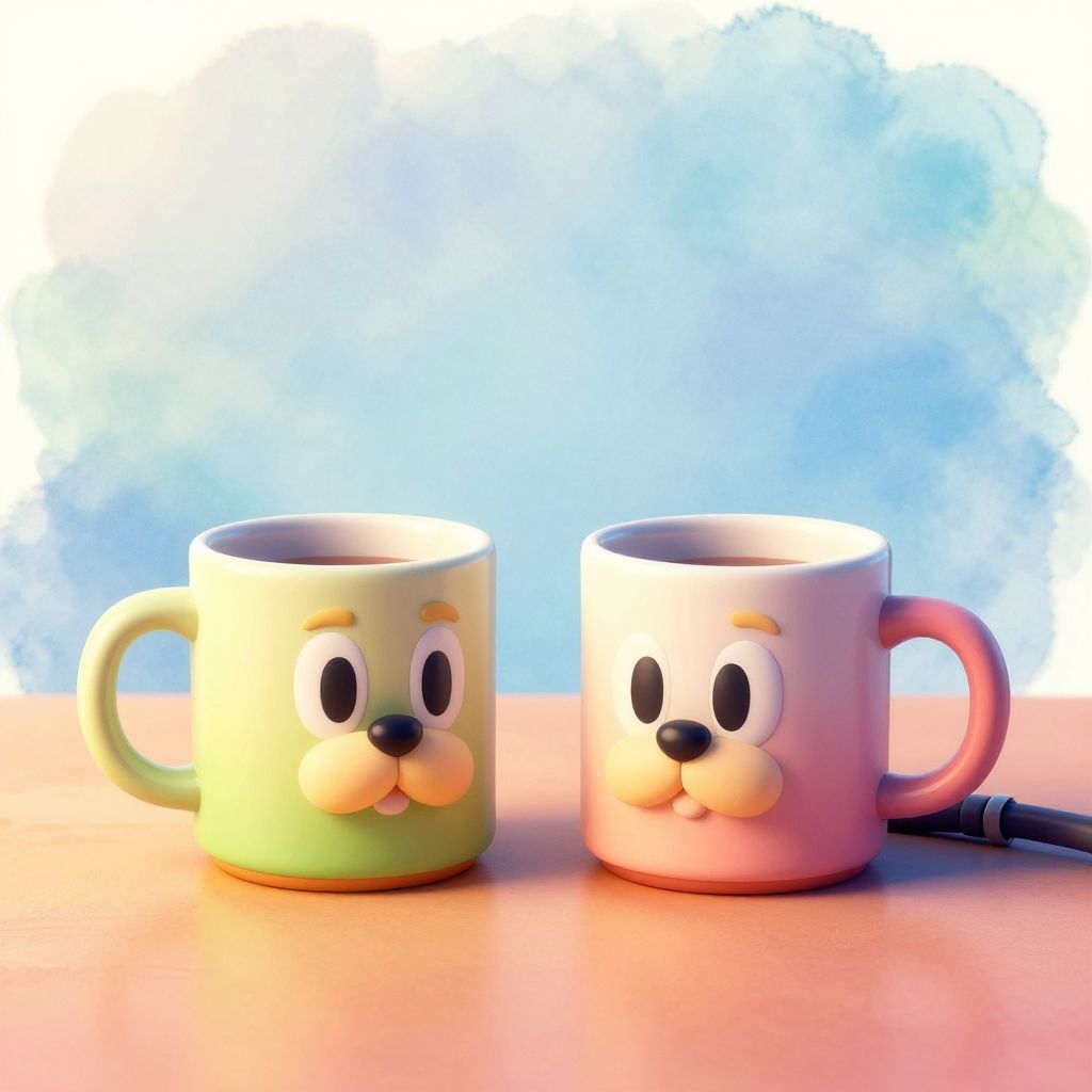 Cuphead video game style, 1930s cartoon, hand drawn, watercolor backgrounds, rubber hose animation two colorful mugs with a dog face on them sitting on a table, coffee cups, 3 d raytraced masterpiece, vray and arnold, rendered in povray, hyper photorealistic raytracing, 3 d render, rendered in cgi, leslie david and lisa frank, rendered in arnold, catdog, realistic 3 d style, photorealistic raytracing