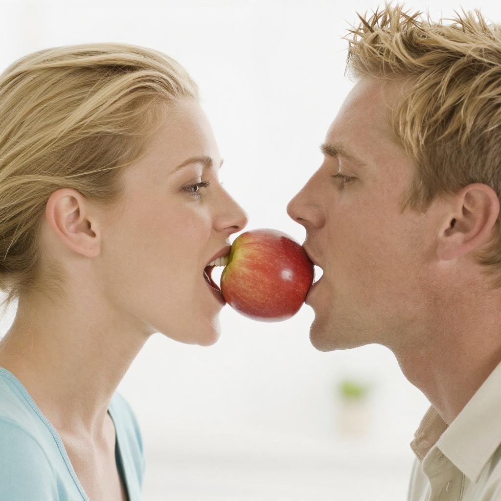 This is a brightly lit, close-up photograph of a blonde woman and a blond man facing each other, about to bite a red apple together. Their profiles are centered, with the apple between their mouths. The woman has her hair in a neat bun and wears a light blue top, while the man has spiky hair and wears a beige shirt. The background is completely white and blurred, with a shallow depth of field focusing on the subjects. The camera angle is straight-on, capturing their upper bodies and faces.