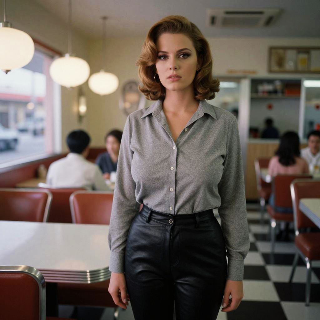 A svelte woman in a grey button-up shirt and black leather pants, stands confidently in a 1960s vintage diner, captured in the rich tones of 3M analog film stock. Sexy. Pretty face and beаutiful eyes. Big breasts