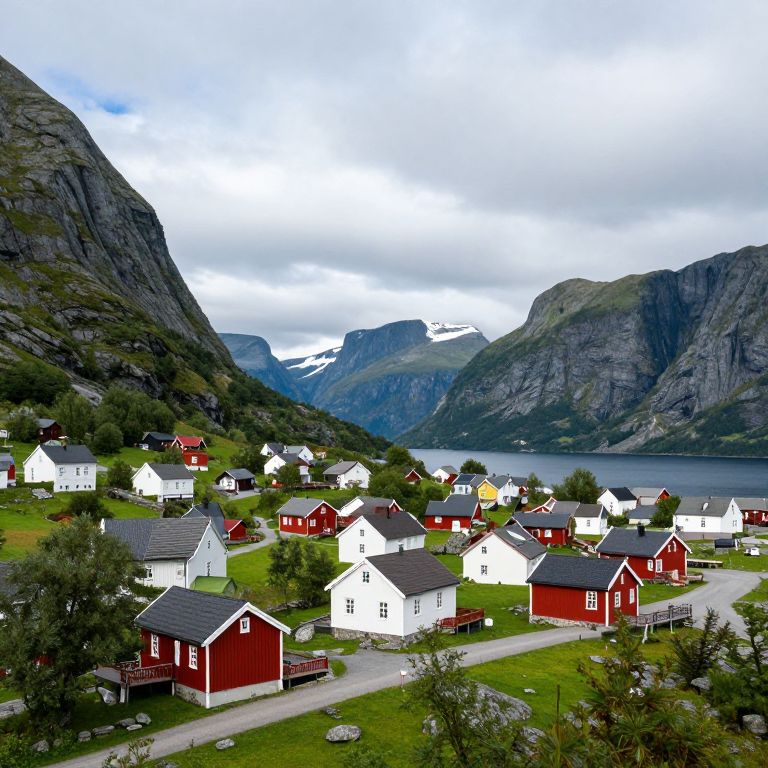 Photograph of a picturesque Nordic village nestled between steep, rocky mountains. The village features colorful wooden houses, predominantly red and white, with dark roofs, scattered across lush green grass. A calm, blue lake is visible in the background, reflecting the overcast sky. Trees and bushes dot the landscape, adding to the serene atmosphere. The houses are arranged in a slightly haphazard pattern along winding roads, creating a charming, quaint setting. The mountains in the background are rugged and gray, contrasting with the bright colors of the village.