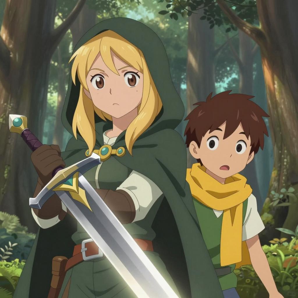 Illustration of a smiling couple in the foreground, with a man and woman in a martial arts outfit in the background. The man has dark hair and a blue shirt, the woman has blonde curled hair and a blue top. Both have intense smiles. Background includes green foliage and a wooden structure.