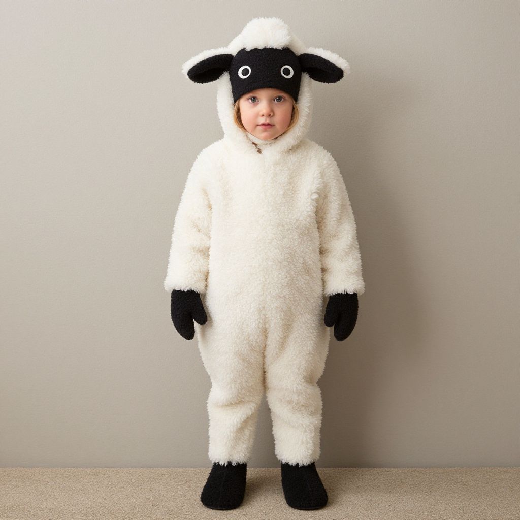 "Suzy Sheep, child wearing a sheep costume standing in front of a wall"