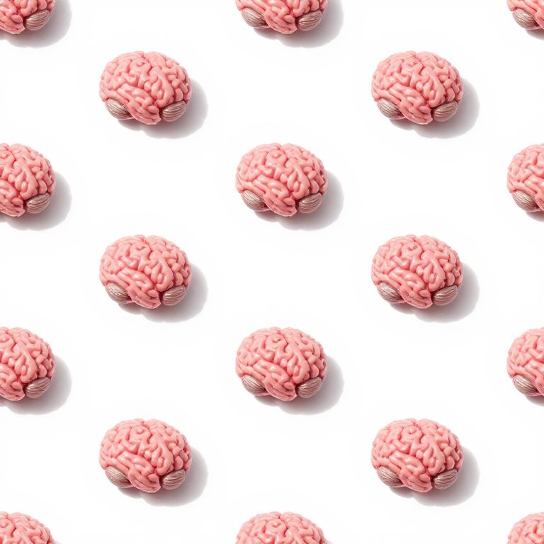 This is a digital illustration featuring a repeating pattern of pink, textured, spherical objects resembling brains. Each sphere is intricately detailed with wrinkled, pinkish-gray folds, mimicking the surface of a brain. The spheres are evenly spaced in a grid-like arrangement on a stark white background, creating a high-contrast visual effect. Each sphere casts a subtle shadow to the bottom right, adding a sense of three-dimensionality. The overall style is clean and minimalist, focusing on the detailed texture and repetitive pattern of the brain-like spheres.