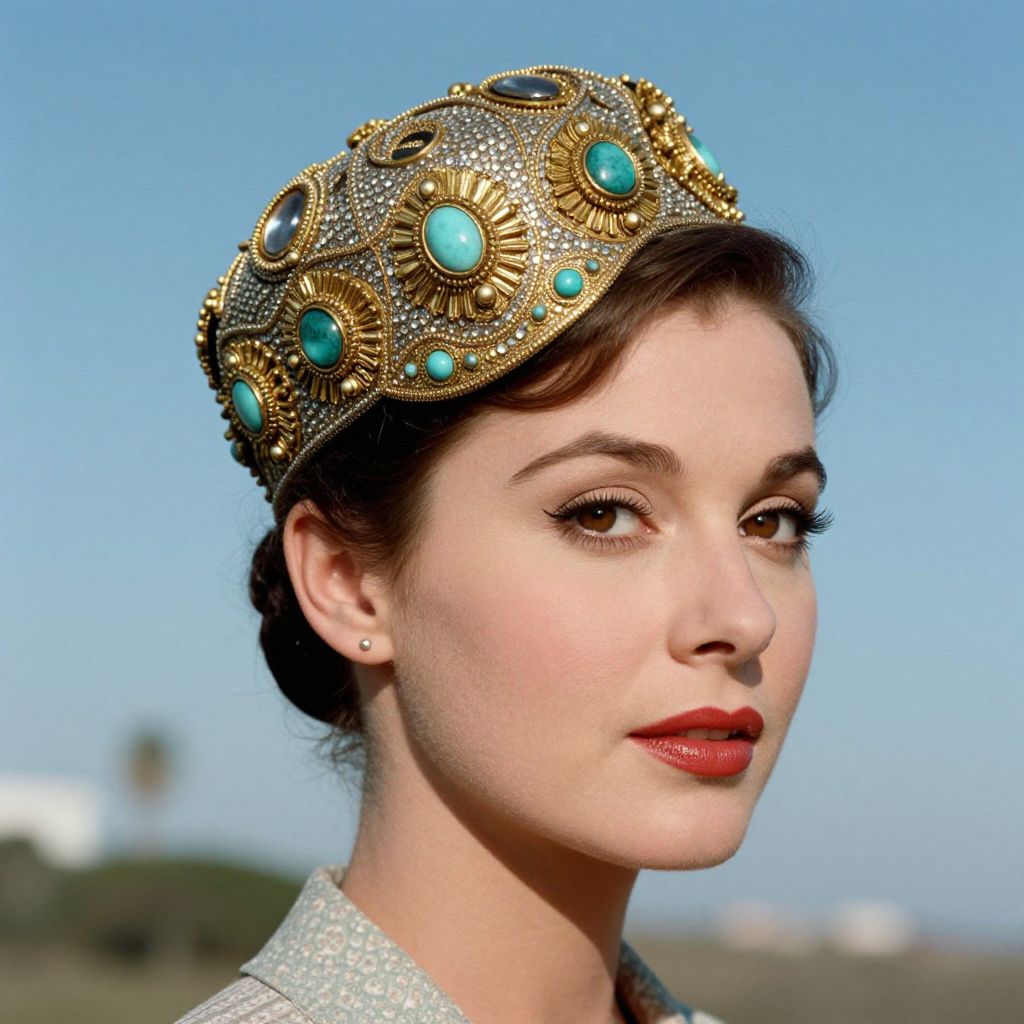 A vintage-inspired photograph captures a woman adorned in a dazzling jeweled cap, featuring intricate gold embellishments and turquoise accents, set against the serene backdrop of Malibu, California, evoking a classic 1950s aesthetic with high-definition detail and natural lighting.