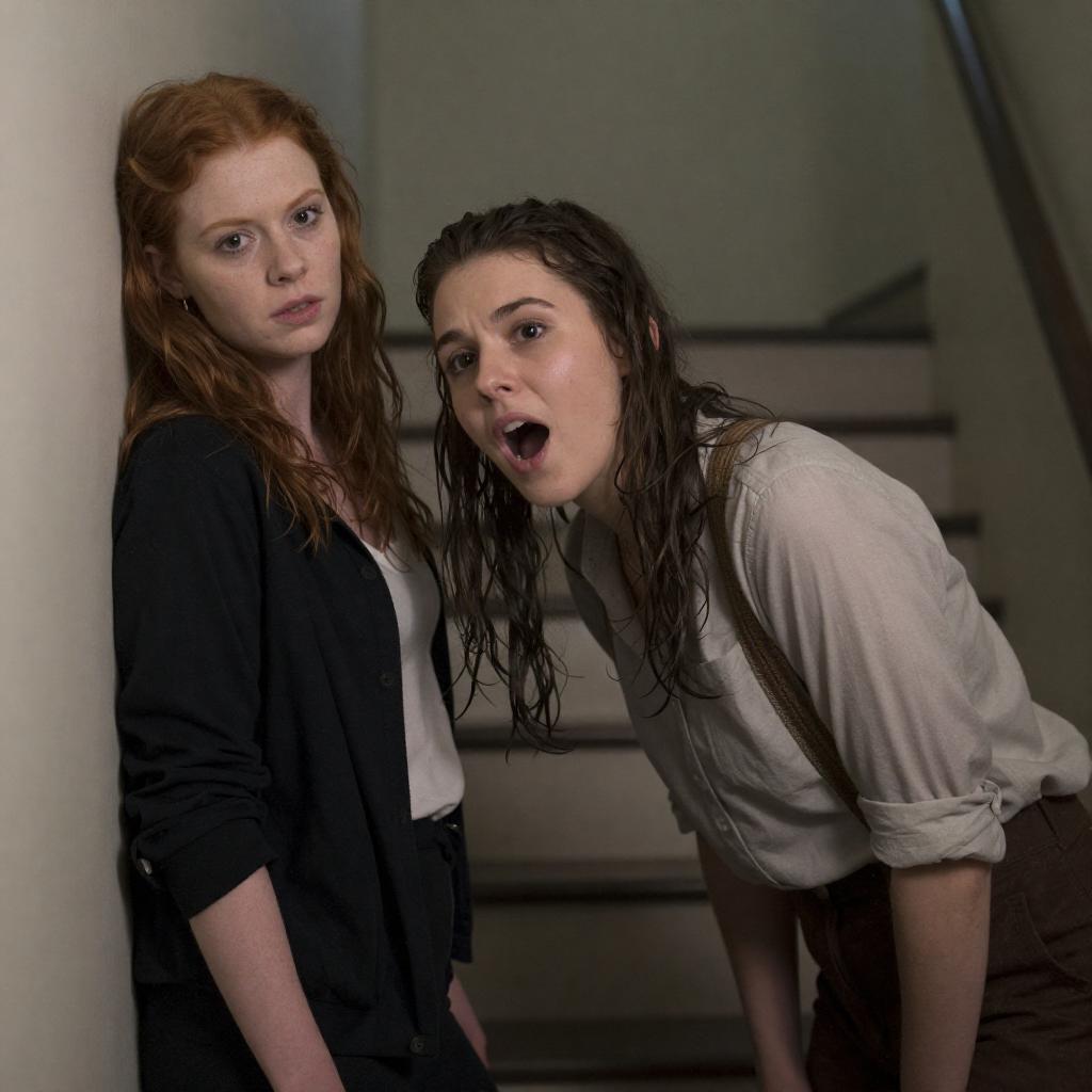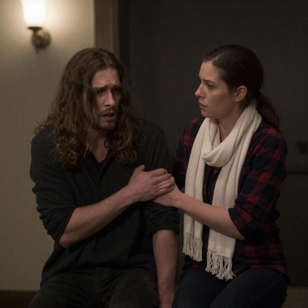 Photograph of a frightened man with long brown hair, dark clothing, and intense expression being pulled by a concerned woman with brown hair, plaid shirt, and white scarf. Dimly lit room, wall sconce, dark background. Both crouched, man to left, woman to right.